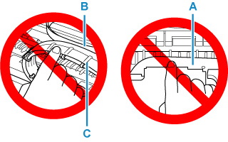 لا تقم بلمس الفيلم الشفاف (A)، أو السير الأبيض (B)، أو الأنابيب (C).