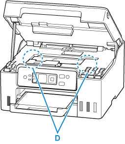 - Czy w pustych przestrzeniach (D) po lewej i prawej stronie drukarki pozostały jeszcze jakieś skrawki papieru?