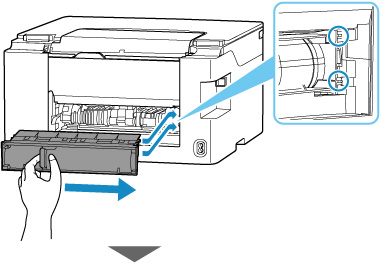 หากไม่ได้ติดตั้งฝาครอบหน่วยการส่งผ่าน ให้ใส่โปรเจคชันทางด้านขวาของฝาครอบหน่วยการส่งผ่านเข้าไปในเครื่องพิมพ์ และดันด้านซ้ายของฝาครอบหน่วยการส่งผ่าน จนกระทั่งปิดสนิท