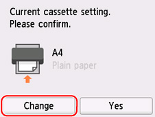 Velg Bytt (Change) og registrer papirinformasjonen (papirstørrelse og medietype) for papiret som er lagt i kassetten til skriveren riktig.
