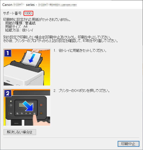 印刷中に用紙がなくなる、または紙づまりなどのトラブルが発生すると、自動的にトラブルの対処方法を示すメッセージが表示されます。トラブルの内容によっては、サポート番号(エラー識別番号)も表示されます。