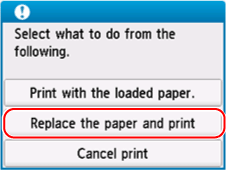 2. Selecteer Vervang het papier en druk af (Replace the paper and print).