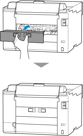 Introduceţi proeminenţele din partea dreaptă a capacului din spate în imprimantă şi împingeţi partea stângă a capacului din spate până când se închide complet.