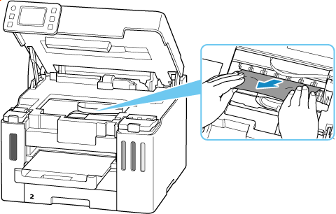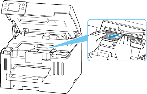 Dacă hârtia este vizibilă în fanta de ieşire a hârtiei, ţineţi-o ferm cu ambele mâini şi trageţi-o încet.