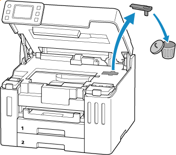 Deschideţi capacul superior şi asiguraţi-vă că a fost îndepărtată banda pentru fixarea suportului capului de imprimare în timpul transportului.