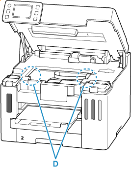 - A rămas hârtie în spaţiile goale din stânga şi din dreapta (D) din imprimantă?