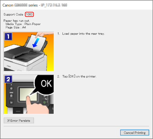 Ако възникне грешка при печатане, например ако хартията свърши или заседне, автоматично се отваря съобщение за отстраняване на неизправности. За някои грешки се показва също код за поддръжка (номер на грешка).