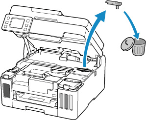 افتح وحدة المسح الضوئي / الغطاء، ثم تأكد من إزالة شريط الشحن اللاصق والمادة الواقية من حامل رأس الطباعة.