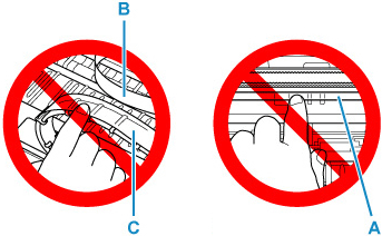 عند إزالة أي عائق لحركة حامل رأس الطباعة، احرص على عدم لمس الفيلم الشفاف (A) أو السير الأبيض (B) أو الأنابيب (C).