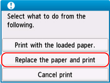 Selezionare Sostituire la carta e stampare (Replace the paper and print).