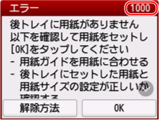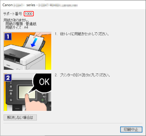 印刷中に用紙がなくなる、または紙づまりなどのトラブルが発生すると、自動的にトラブルの対処方法を示すメッセージが表示されます。トラブルの内容によっては、サポート番号(エラー識別番号)も表示されます。