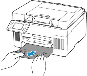 Dopo aver riposto il vassoio di uscita della carta, estrarre il cassetto e rimuovere lentamente la carta inceppata con entrambe le mani.