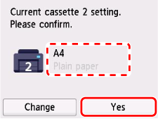 Kontrollera pappersinformationen (pappersstorlek och medietyp) och välj Ja (Yes).