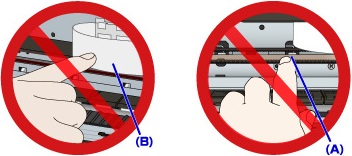عند إزالة عائق حركة حامل رأس الطباعة، احرص على عدم لمس الفيلم الشفاف (A) أو السير الأبيض (B).