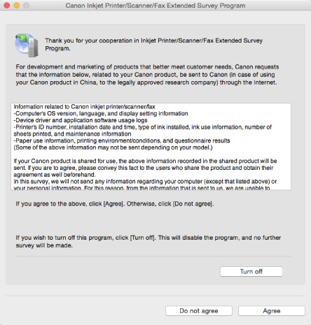 Clique em Desligar (Turn off). Isso interrompe o Inkjet Printer/Scanner/Fax Extended Survey Program e as informações não são enviadas. Para retomar a pesquisa, consulte Alterando a configuração:.