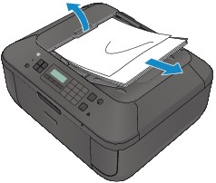Jei dokumentas įstrigęs dokumentų išvesties angoje, uždarykite dokumentų dėklą, kaip parodyta toliau pateiktame paveikslėlyje, ir ištraukite dokumentą.