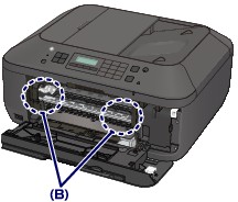 Ima li komadića papira na desnoj ili lijevoj strani (B) unutar uređaja?