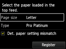 Select Register and press the printer's OK button to finish setting the top feed paper settings.