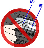 Kada izvadite zaglavljeni papir ili zaštitni materijal koji sprječava pomicanje držača ispisne glave, pazite da ne dodirnete prozirnu foliju (A) ili bijeli pojas (B).