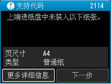 如果在打印时指定的纸张设置与在打印机上注册的上端进纸盘纸张信息不同,则打印机的LCD屏幕上将出现以下信息。