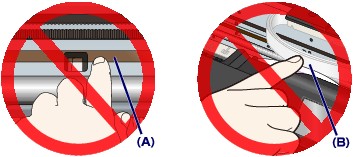 ขณะนำสิ่งกีดขวางต่อการเคลื่อนที่ของตัวยึดหัวพิมพ์ออก ควรระวังไม่ให้สัมผัสฟิล์มใส (A) หรือสายพานสีขาว (B)