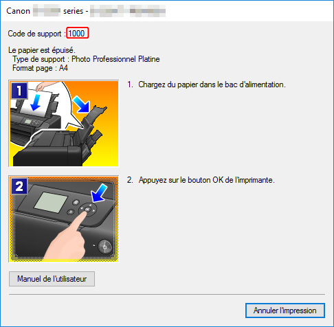 Si une erreur se produit lors de l'impression, par exemple si le papier est épuisé ou coincé, un message de dépannage s'affiche automatiquement. Suivez la procédure adéquate décrite dans le message.