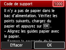 Si une erreur se produit lors de l'impression, par exemple si le papier est épuisé ou coincé, un message de dépannage s'affiche automatiquement. Pour certaines erreurs, un code de support (numéro de l'erreur) s'affiche également.