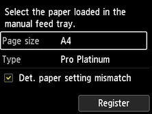 Če se prikaže zaslon, podoben naslednjemu, registracija informacij o papirju v pladnju za ročno podajanje ni dokončana.
