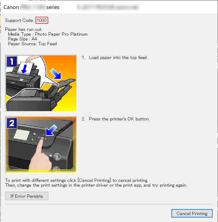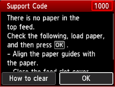 Când survine o eroare, pe computer sau pe imprimantă se afişează un mesaj. Pentru unele erori, se afişează şi un cod de suport (număr de eroare).