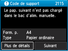 Si les paramètres du papier spécifiés lors de l'impression diffèrent des informations sur le papier pour le bac d'alimentation manuelle enregistrées sur l'imprimante, le message suivant apparaît sur l'écran LCD de l'imprimante.