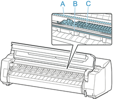 • Do not touch the linear scale (A), carriage shaft (B), or ink tube Stabilizer (C). Touching these may cause malfunction.