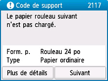 Si les paramètres du papier spécifiés lors de l'impression diffèrent des informations papier pour le rouleau enregistré sur l'imprimante, le message suivant apparaît sur l’écran tactile de l’imprimante.