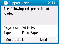 Nota- Se non si conoscono il formato e il tipo di supporto del rotolo di carta da caricare, premere il pulsante Indietro (Back) sulla stampante. Vengono visualizzati il formato carta e il tipo di supporto.