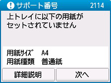 例えば、以下のように、印刷するときに指定した用紙設定と、プリンターに登録した上トレイの用紙情報が異なると、プリンターのタッチスクリーンにメッセージが表示されます。