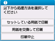 例えば、印刷するときに指定した用紙サイズがA4で、上トレイの用紙情報はA3と登録していた場合に、この選択肢を選ぶと、上トレイの用紙をA4に交換した後に印刷を開始します。