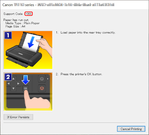 Εάν παρουσιαστεί κάποιο σφάλμα κατά την εκτύπωση, π.χ. εάν τελειώσει το χαρτί ή παρουσιαστεί εμπλοκή χαρτιού, θα εμφανιστεί αυτόματα ένα μήνυμα αντιμετώπισης προβλημάτων. Για ορισμένα σφάλματα, εμφανίζεται επίσης ένας κωδικός υποστήριξης (αριθμός σφάλματος).