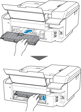Introduceţi proeminenţele din partea dreaptă a capacului din spate în imprimantă, apoi împingeţi partea stângă a capacului din spate până când se închide complet.