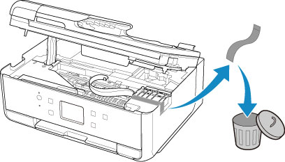 Откройте модуль сканирования / крышку и убедитесь, что транспортировочная крепежная лента держателя печатающей головки удалена.