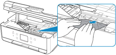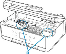 - A rămas hârtie în spaţiile goale din stânga şi din dreapta (B) din imprimantă?