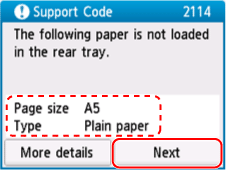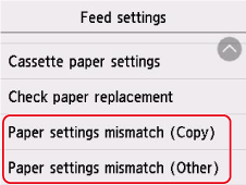 Valige Paberimäär. sobimatud (Koopia) (Paper settings mismatch (Copy)) või Paberimäär. sobimatud (Muu) (Paper settings mismatch (Other)).