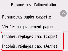 Sélectionnez Incohér. réglages pap. (Copie) ou Incohér. réglages pap. (Autre).