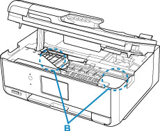 - Ar popieriaus neliko tuščiose ertmėse (B) spausdintuvo kairėje ir dešinėje?