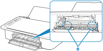 - A rămas hârtie în spaţiile goale din stânga şi din dreapta (B) din imprimantă?