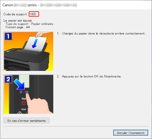 Si une erreur se produit pendant l'impression, par exemple lorsque l'imprimante vient à manquer de papier ou en cas de bourrage papier, un message de dépannage s'affiche automatiquement sur l'écran de l'ordinateur. Pour certaines erreurs, un code de support (numéro de l'erreur) s'affiche également.