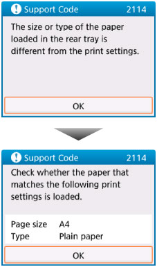 Jei spausdinant arba kopijuojant taikomi popieriaus parametrai neatitinka spausdintuve nustatytos į galinį dėklą įdėto popieriaus informacijos, kaip parodyta toliau, LCD pateikiamas pranešimas.