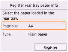 Pasirinkite Registruoti (Register) ir nustatykite visus į galinį dėklą įdėto popieriaus parametrus.