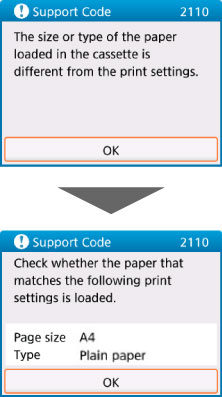 - Sebagai contoh, jika setelan kertas cetak atau salin adalah A5, dan informasi kertas kotak kertas diset ke A4, ganti kertas dalam kotak kertas ke kertas A5 dan lanjutkan pencetakan atau penyalinan.