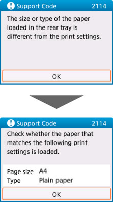 Jika setelan kertas cetak atau kertas salin tidak sesuai dengan informasi kertas tatakan belakang yang diset pada pencetak, seperti yang ditunjukkan di bawah ini, pesan akan muncul pada LCD.