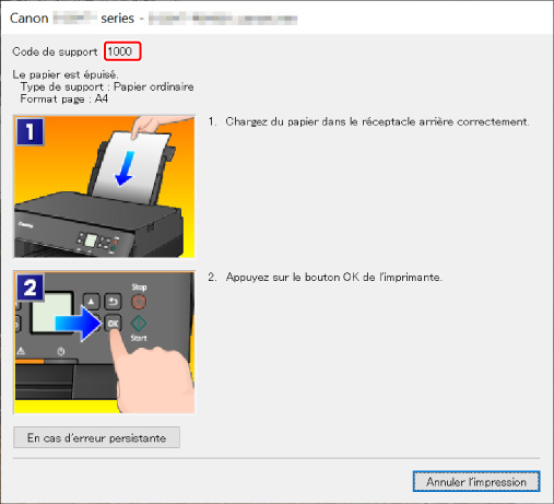 Lorsqu'une erreur se produit, un message s'affiche sur l'ordinateur ou sur l'imprimante. Pour certaines erreurs, un code de support (numéro de l'erreur) s'affiche également.