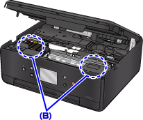 - هل يوجد أي ورق متبقٍ في المساحتين الفارغتين اليسرى واليمنى (B) في الطابعة؟
